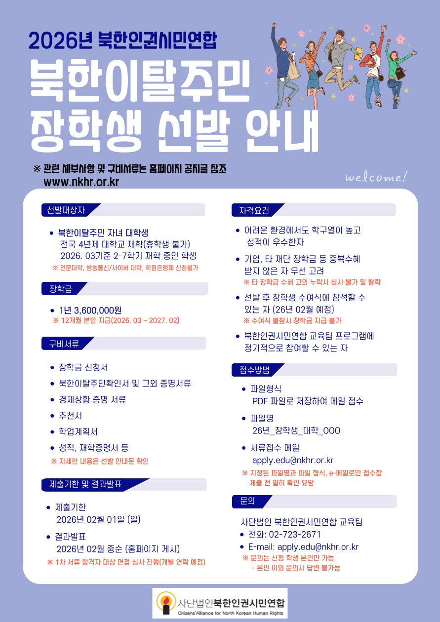 사단법인 북한인권시민연합은 어려운 환경 속에서도 학업에 정진하며 리더로 성장할 가능성을 지닌 학생을 대상으로