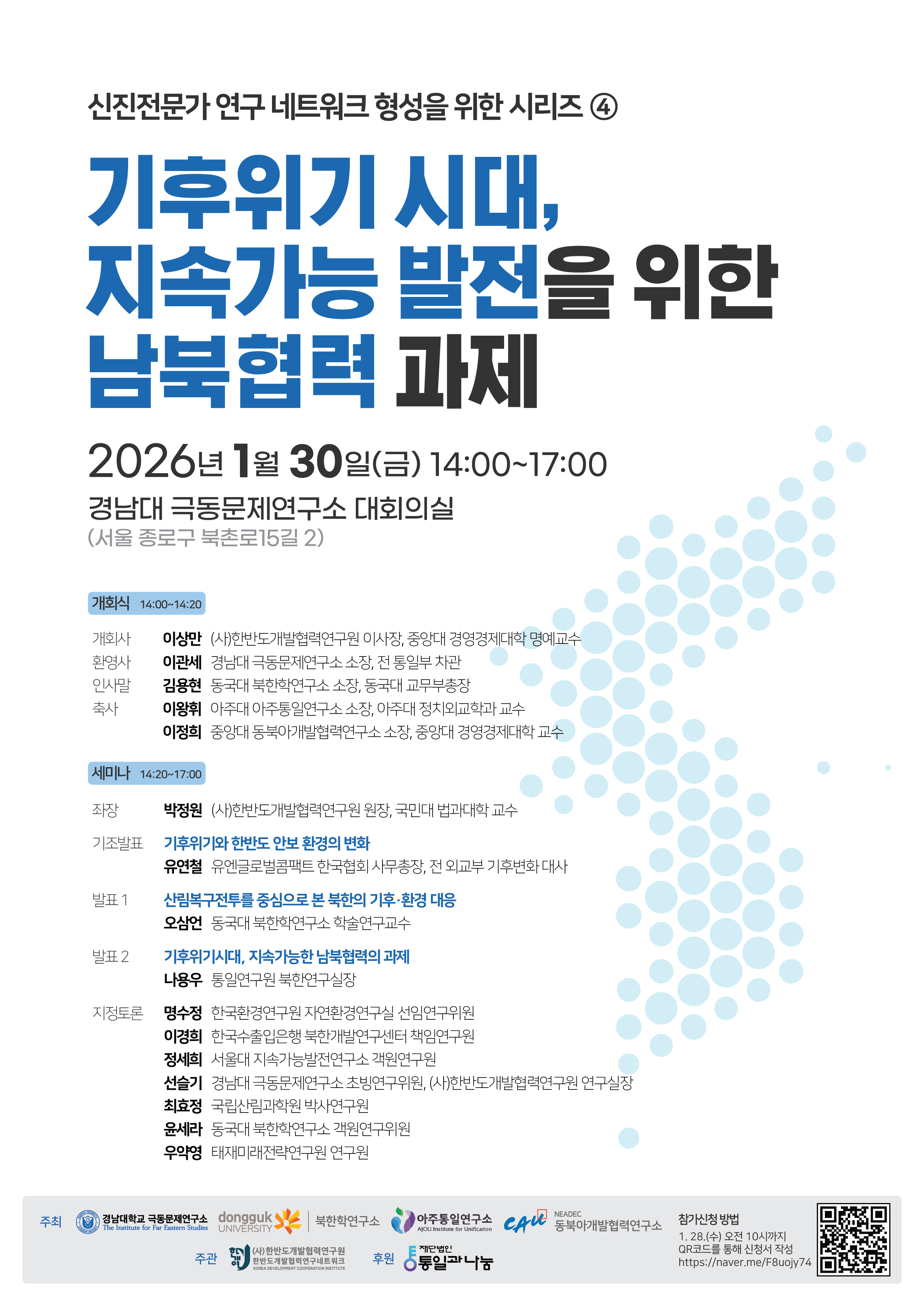 기후 변화가 안보와 환경, 그리고 남북협력에 던지는 과제를 국내 주요 전문가들과 함께 심층적으로 논의합니다.